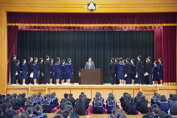 本日6校時、旧生徒会役員退任式、新生徒会役員任命式を行いました。