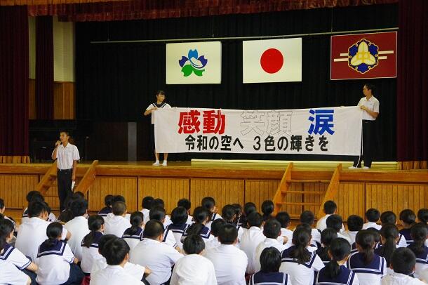 最初に体育大会実行委員から体育大会のスローガンが発表されたあと、団長によるくじ引きで団色が決定しました。
