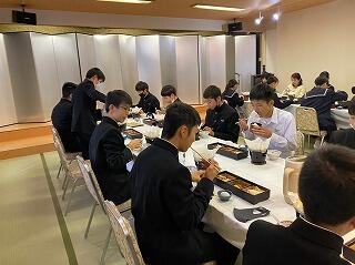 修学旅行1日目は福岡県に到着しました。到着して、まずは昼食をいただきました。早朝から移動でしたので、おかわりをする生徒も見られました。