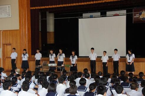 各部からの決意表明の後、学校長と生徒会からの激励の言葉、選手代表宣誓、校歌斉唱と、秋の中体連に向けて気持ちを高めていました。妻ケ丘中の代表として、正々堂々と戦ってきてほしいと思います。部活動生の健闘を祈ります。