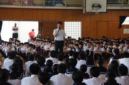 各部からの決意表明の後、学校長と生徒会からの激励の言葉、選手代表宣誓、校歌斉唱と、秋の中体連に向けて気持ちを高めていました。妻ケ丘中の代表として、正々堂々と戦ってきてほしいと思います。部活動生の健闘を祈ります。