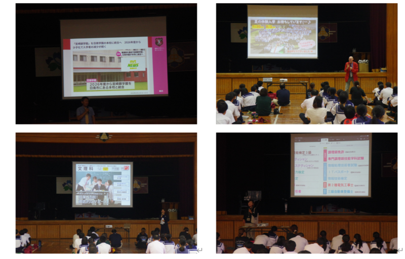 本日午後は、都城高校、都城東高校、都城聖ドミニコ学園高校、鵬翔高校、宮崎第一高校、日南学園高校、日章学園高校、宮崎日大高校の8校の先生方をお迎えして、第1回高校説明会を実施しました。あいにくの天候の中でしたが、ご参加いただいた保護者の皆様、ありがとうございました。子どもたちも今後の進路選択に向けて、真剣にメモをとりながら話を聞く姿が見られました。