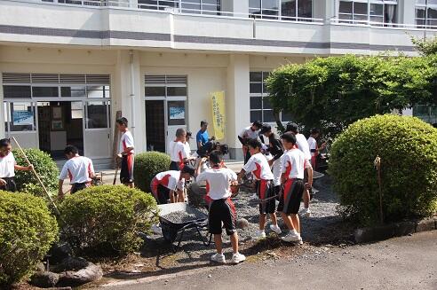 8月6日・7日の2日間で、サッカー部、柔道部、男子バレーボール部、野球部の皆さんの力を借りて、ひょうたん池の清掃・整備を行っています。強い日差しが照りつける中ですが、子どもたちが一生懸命作業してくれています。