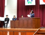 各学年の代表者(1年 藤本陽咲さん、2年 来住優樹さん 3年 壽福太星さん 松沢莉子さん代読)、生徒会代表(2年 逆瀬川瑛人さん)が2学期の反省を発表しました。