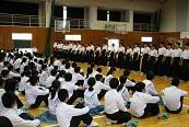 都城地区中学校総合体育大会に出場する選手団の激励式が行われました。選手団はユニフォームに着替え、大会に向けて、熱い思いを述べました。今年度、部活動生に関する集会が何度か行われてきましたが、模範となるすばらしい姿を見せてくれています。この日も、素晴らしい態度で臨んでくれました。日々の鍛錬がきっと素晴らしい成果を出してくれることと期待しています。
