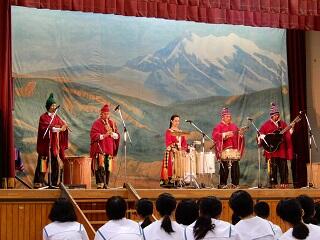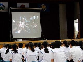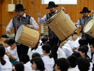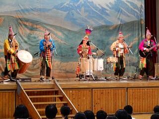 鑑賞教室が行われ、ボリビアの実力派グループ「クルス・デル・スール」の皆さんに演奏をしていただきました。弦楽器と笛が中心で、「コンドルは飛んでいく」など、とても心地の良い音楽ばかりで、心が洗われる気持ちになりました。