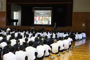 2、3年生を対象に、高校説明会が行われました。この高校説明会は2回に分けて行われ、今回はその1回目です。五十市中に近い学校に来ていただき、学科のことや学校行事、進路先、部活動などについて紹介していただきました。特に3年生は、間近に迫ってきた進路選択の参考にしてくれることでしょう。