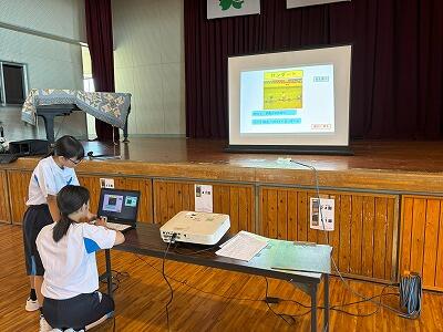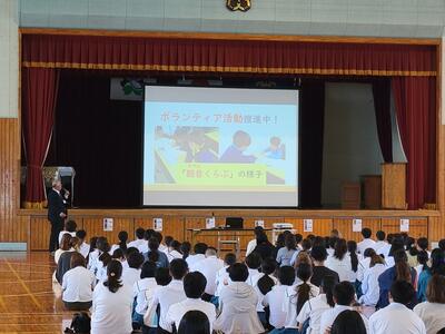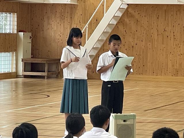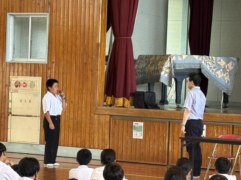 次に、平和について考えました。来月開催される新市誕生20周年・戦後80年事業「桜舞」のキャストに挑戦する神坂ことさんが、公演のあらすじを紹介しました。そして、学年主任 森山先生は、お父様が五十市地区で体験された戦争中のお話をされました。