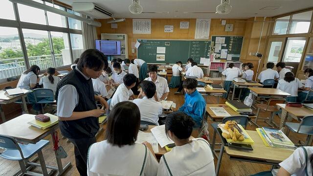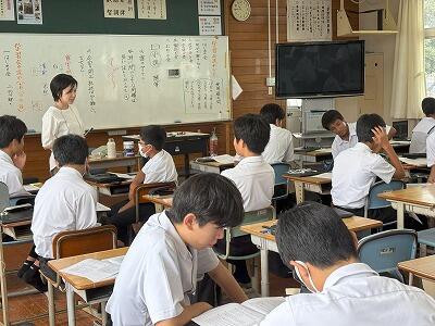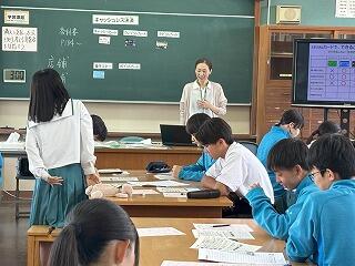 6月18日(水)2校時、2年4組にて堤達哉教諭の研究授業(社会)がありました。生徒は教科書やタブレットを活用し、たくさんの資料を読み取りながら意見を交換していました。集中して主体的に学びを深めている様子がうかがえ、次の授業の展開も楽しみです。