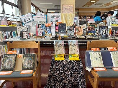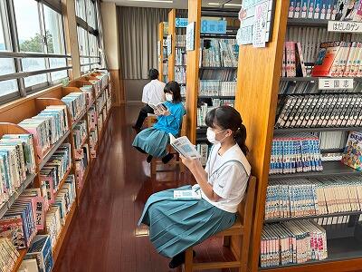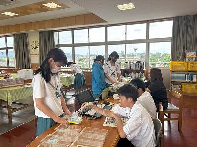 昼休みに図書室に行ってみると、20名ほどの生徒の皆さんが本に親しんでいました。興味のある本を手にして、気持ち穏やかに読んでいる人、家で読むための本を借りている人、図書係の仕事に楽しく取り組んでいる人がいました。