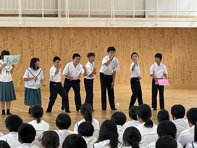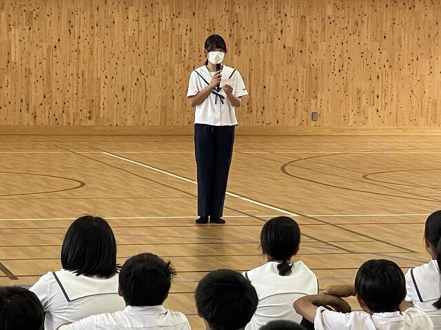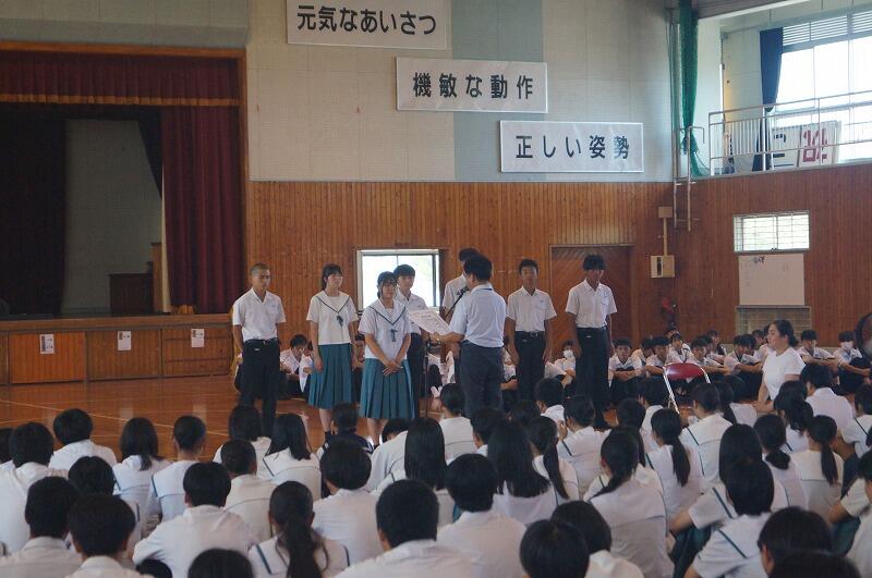 6月27日(金)、第1学年は学年集会を行いました。内容は主に2つで、学年生徒会が中心になって会を進めました。