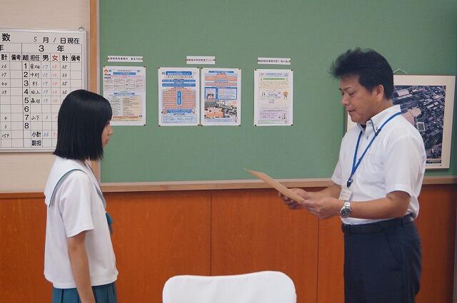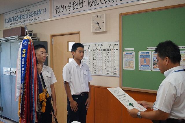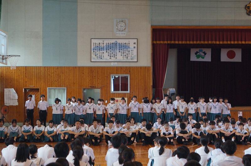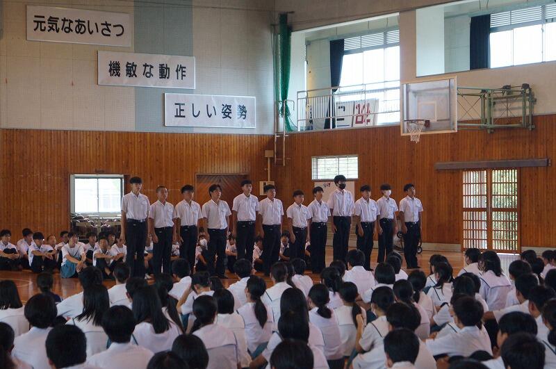各部の代表者から決意表明があり、生徒会長の竹山さんが激励の言葉を述べました。その後、校長先生から「伝統のある五十市中生として、また、都城地区の代表として堂々と戦ってきてほしい。吹奏楽部は、本番までにしっかり調整して、美しいハーモニーをホールいっぱいに響かせてほしい。」と激励がありました。