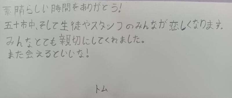 トム先生からのメッセージを紹介します。トム先生が一生懸命書いた日本語のメッセージは、気持ちのこもった温かいメッセージでした。