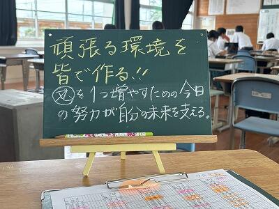 3分前入室2分前着席を完璧にして、授業態度や生活面を改善させたい。そして、学校行事や定期テストに全力で取り組む学年になりたい。