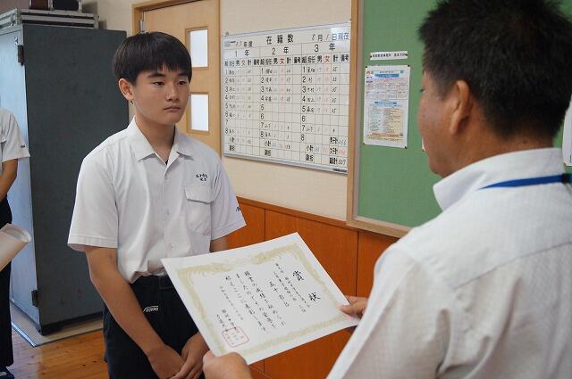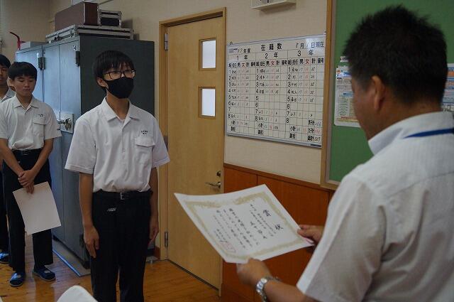 激励式に先だって、第76回都城地区中学校総合体育大会の表彰式を行いました。各部とも優勝は逃しましたが、これほどの部が団体での入賞を果たしました。また、個人の部でも多くの選手が入賞しました。
