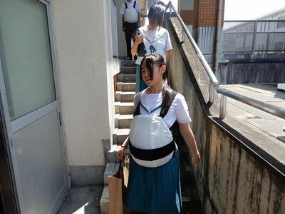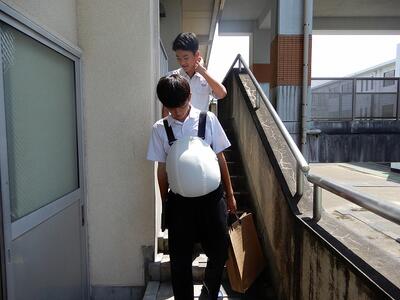 腹部に5kgの重りを装着し、階段の上り下り、椅子に座る動作などを行い、生徒は汗をかきながら真剣に体験していました。活動を終えた生徒の感想を紹介します。