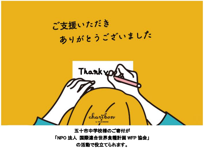 昨年度、総合的な学習の時間で1年生はSDGsについて調べました。1年2組はSDGsの目標番号1番の「貧困をなくそう」について調べ、この問題解決のために、『charibon(チャリボン)』という活動に注目しました。チャリボンとは本を寄付してお金に変え、そのお金を募金することです。数多くある支援したい団体の中から、国際連合世界食糧計画WFP協会に寄付をしようと決め、全校生徒に声をかけて、本を集めました。21冊の本が集まり、査定に出したところ、12冊を買い取っていただきました。寄付金額は766円でした。買い取れなかった本の一部は、「捨てたくない本プロジェクト」として様々な場所で活用されているようです。『チャリボン』について詳しく知りたい方・活動してみたい方は、ぜひ検索してみてください。