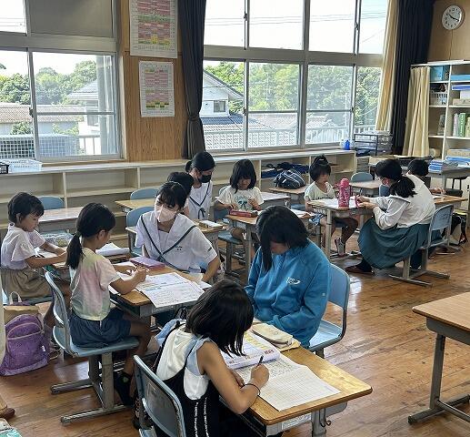 夏休み期間中、五十市中ボランティアクラブの生徒34名が、五十市地区社会福祉協議会・都城市社会福祉協議会主催の学習支援事業『五小っ子study room』『今町っ子まなび館』に、学生ボランティアとして小学生の学習支援サポートや自主学習時間の見守りに参加しました。