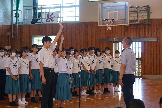 激励式では、各部活動の代表者から決意表明があり、校長先生からの激励の言葉、男子バレーボール部主将(赤木賢晟さん)、女子バレーボール部主将(津曲柚希さん)の選手宣誓が行われました。