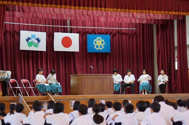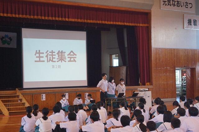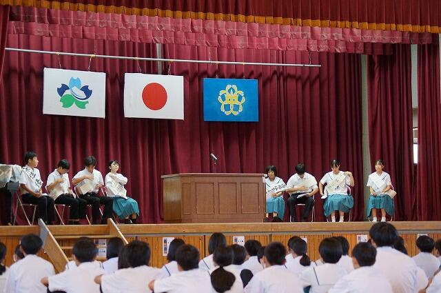 執行部からの挨拶については、最近挨拶運動を始めた女子バレーボール部の主将(津曲柚希さん)に挨拶運動を始めたきっかけなどのインタビューがありました。女子バレーボール部に続き男子ソフトテニス部も挨拶運動を始め、朝から元気の良い挨拶が飛び交っています。「STAR5」を意識し、全校生徒で気持ちの良い挨拶をしていきましょう。