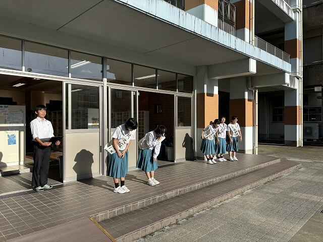今朝も女子バレーボール部と男子ソフトテニス部の生徒が挨拶運動を行っていました。活動を初めて約2週間、登校する生徒の挨拶もどんどん大きくなってきていると思います。両部のみなさん、本当にありがとうございます。