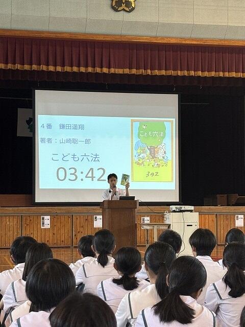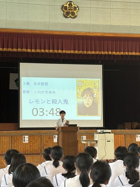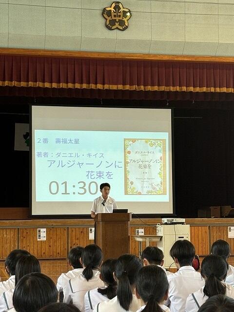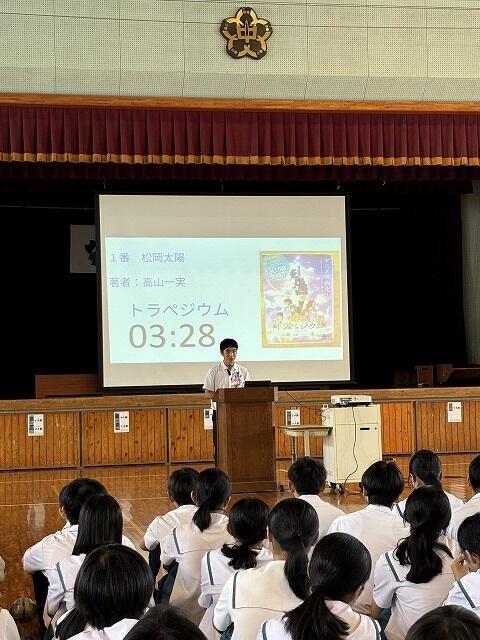 9月19日(木)5校時に体育館にて第2学年ビブリオバトルを行いました。各学級から1名の代表者、計5名が4分間で本の紹介を行いました。5名とも本番に向けて一生懸命準備し、緊張を感じさせない立派な発表を見せてくれました。昨年よりも堂々としており、一年間での成長も見せてくれました。