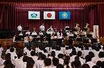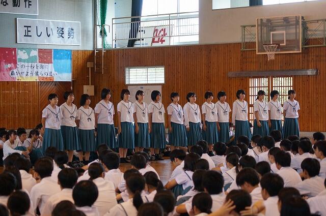 県大会に出場する代表者からの決意表明があり、校長先生からの激励のことば、生徒会代表激励のことば(3年 長曾我部輝さん)、選手代表宣誓(男子バスケットボール部主将 2年 福原星吾さん)を行いました。