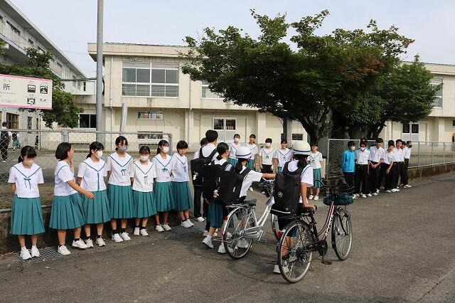 朝の涼しい風と共に、五十市中学校に元気のいい爽やかなあいさつが広がっています。