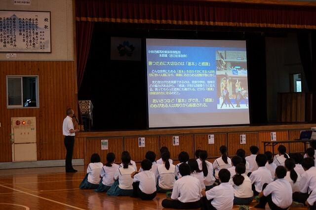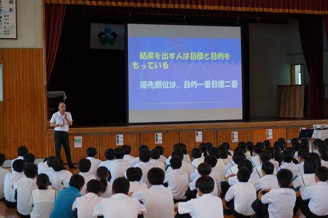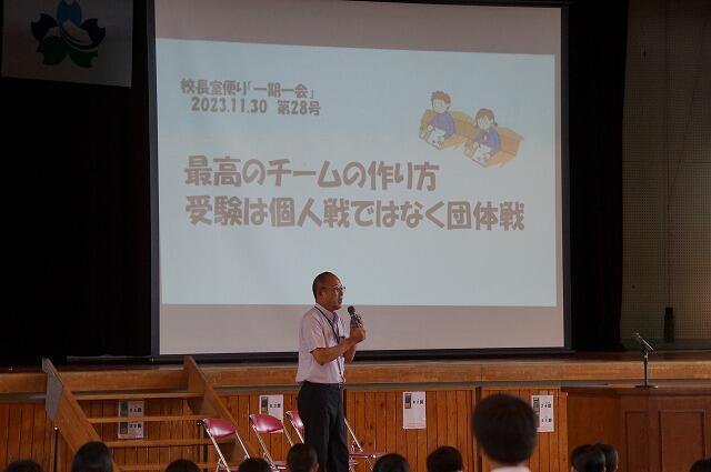 校長先生からは、灘高等学校合格者数全国1位有名塾講師 木下晴弘さんのお話を基に、学級や部活動、組織の在り方のお話がありました。「グループ」ではなく「チーム」を作り、全員で目標に向かって頑張ろうという内容でした。