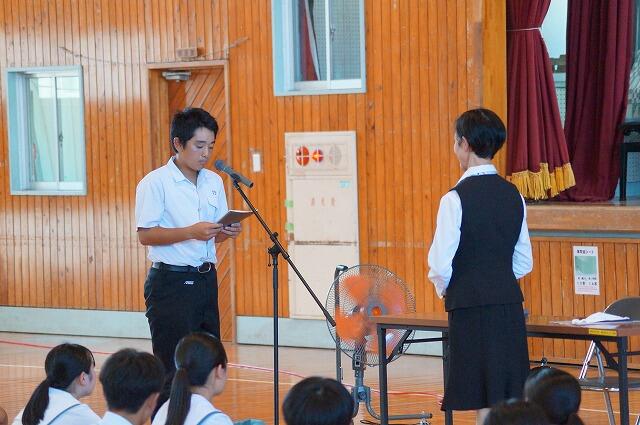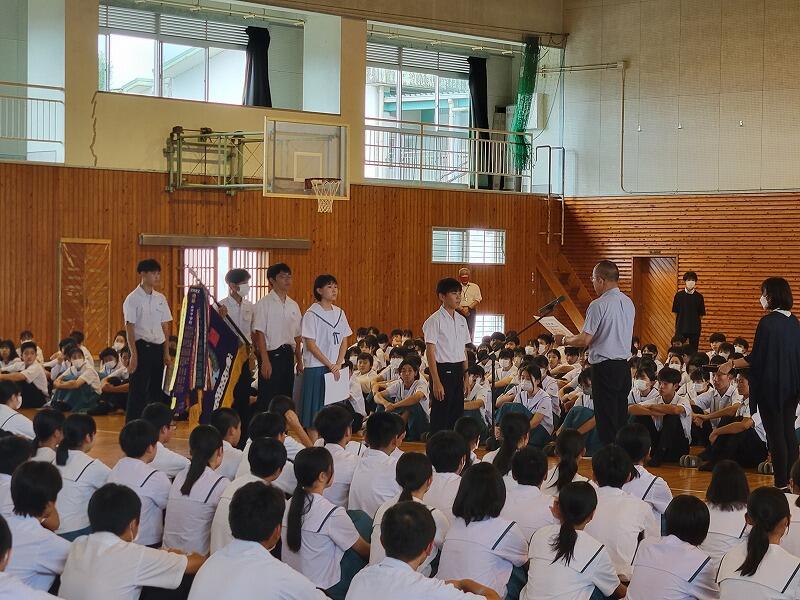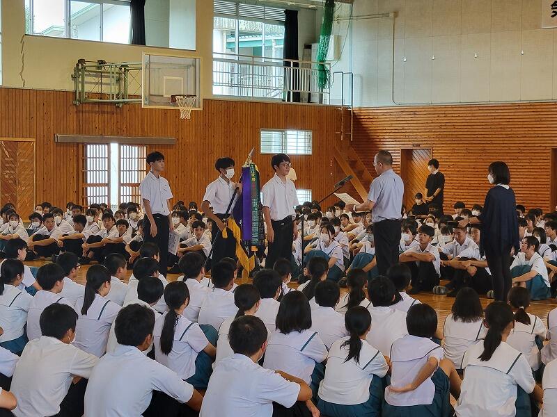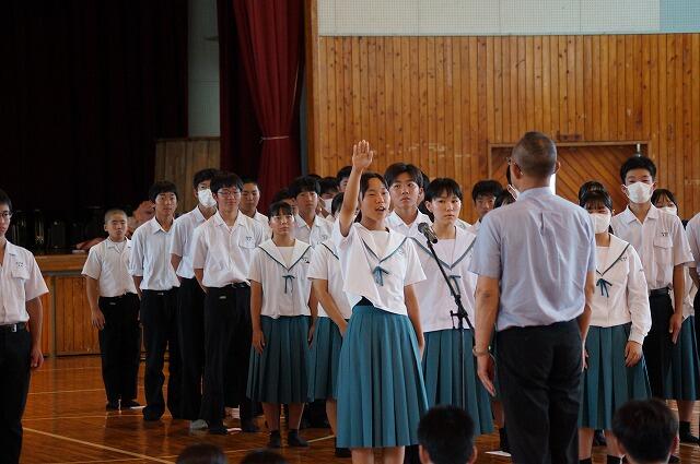 激励式では、県総合体育大会と県吹奏楽コンクールに出場する代表者からの決意表明があり、吹奏楽部からコンクールで演奏する曲の発表がありました。その後、生徒代表激励の言葉(生徒会長:幸野侑桜さん)、校長先生からの激励の言葉、陸上部主将(神村彩さん)の選手代表宣誓が行われました。