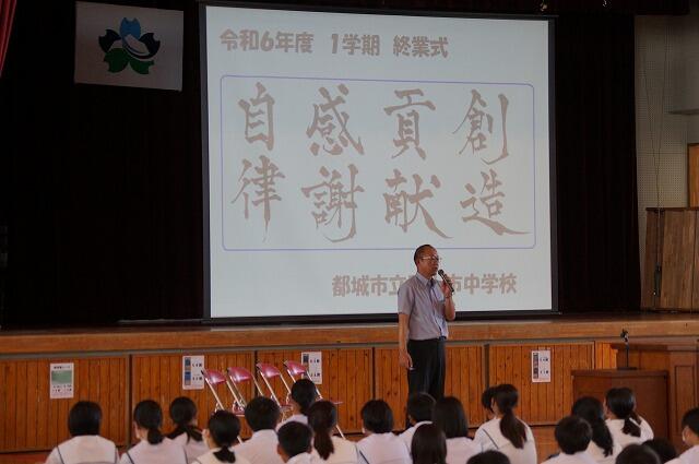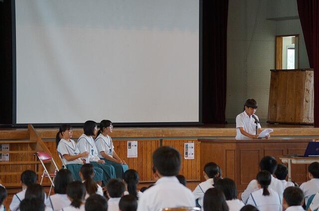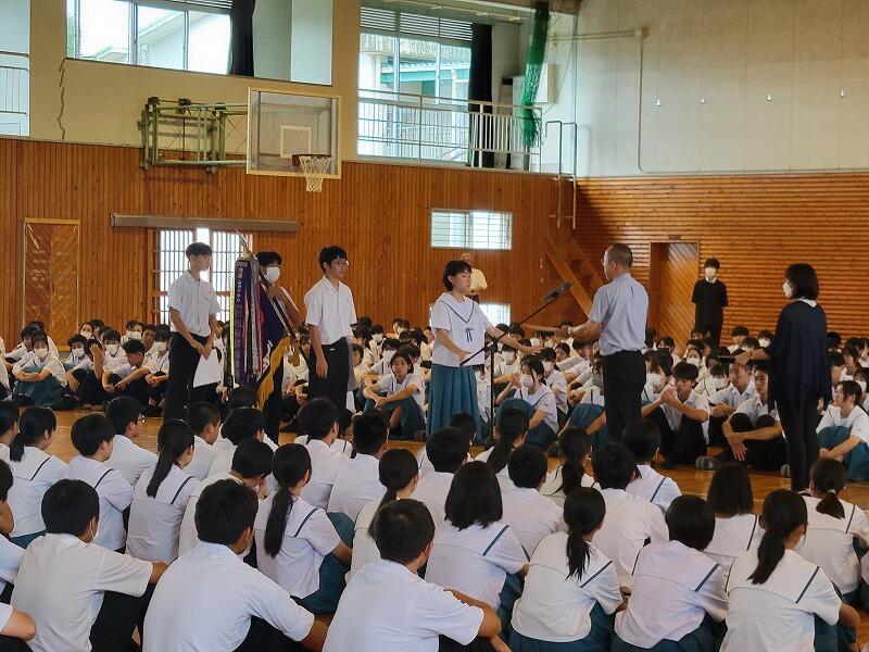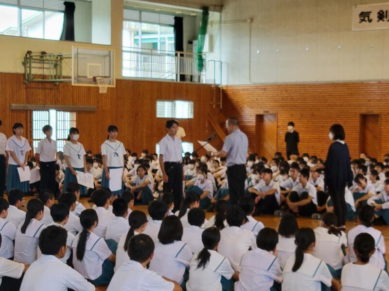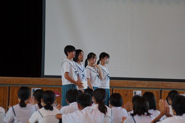 各学年の代表者(1年 長谷川真那さん、2年 早田留歌さん、3年 井手上愛咲さん)、生徒会代表者(3年 福丸あかりさん)が1学期の反省を発表しました。生活面、勉強面、部活面など様々な視点で1学期を振り返り、夏休み、2学期の過ごし方を述べました。
