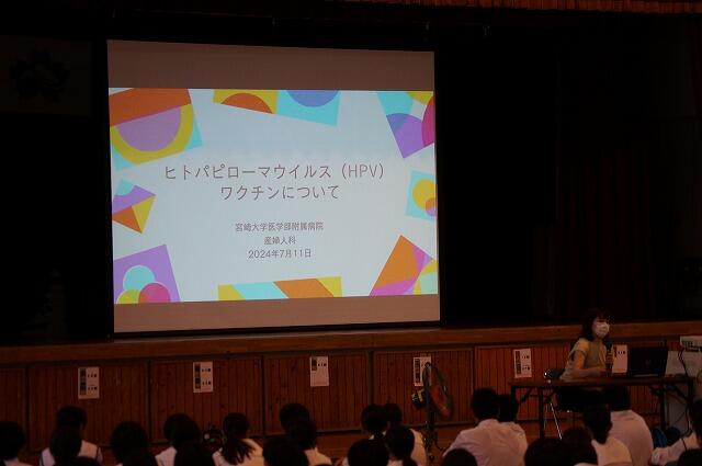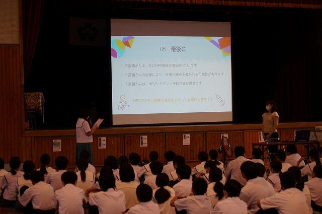 講話では、がんを予防するためのワクチン接種、定期健診の大切さを学びました。生徒達は、がんは誰にでも起こりうることだということを受け止め、真剣に聞く姿が見られました。