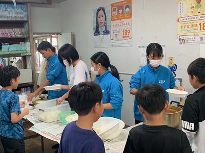 ボランティア活動の内容は、会場設営やカレーの配膳、そして子ども達と遊ぶことでした。カレーを食べたあと紙芝居もあり、子供たちとの交流時間もとれてよかったです。また機会があったら参加したいと思いました。(津曲 陽華)