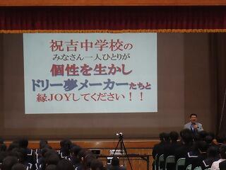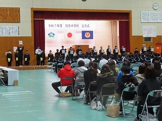 校長先生からは始めに、正門近くに設置された新たな「祝吉地区こどものちかい」看板と地域の方からの図書の寄贈の紹介がありました。 続いて新年のあいさつやことばの大切さ、新年の計画について紹介をされ、3学期は、3年生は、「義務教育のまとめをしてほしい」、1・2年生は、「次の学年に進級する準備をしてほしい。」と話がありました。
