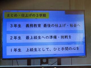式後には、学習指導、保健指導、生徒指導の先生から、3学期の生活の話がありました。先生方の話をしっかり守り、充実した3学期の生活を送ってほしいと思います。