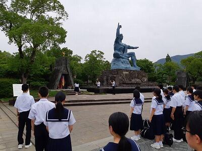 あいにくの雨天でしたが、長崎市 平和公園にて平和集会を行い平和を継続することを誓いました。また、原爆資料館では被爆して溶けた金属、植物の影が焼き付いた板などの被爆後の状況を目のあたりにし、改めて平和の尊さを学びました。