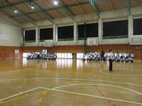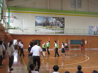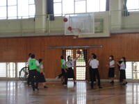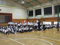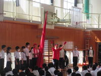 その後、あらかじめ編成されたA団、B団それぞれから代表された3年生による団色決定のバトルです。団色を引く順番を競います。今年度は、時間内のフリースロー対決でした。シュートが決まるたびに、それぞれの団員から大きな歓声が沸き上がっていました。ひさびさに全校生徒が集まり、声を出して盛り上がる雰囲気に、何かジーンとするものがありました