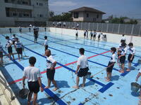 5月下旬に保健体育の授業でプール清掃を行いました。元気な子どもたちの歓声とともに、みるみるうちにプールがキレイに磨かれていきます。