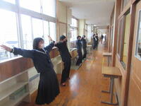 晴天であれば運動場からの計画でしたが、雨天であったため、3年生の教室前廊下で実施しました。