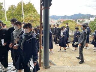 天気は曇りですが、生徒は晴れ晴れした笑顔です。