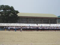 初めての全体練習では、全校生徒が運動場に集合し、赤団・青団に分かれて整列、開閉会式の確認並びに役員指導を行いました。