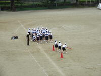 初めての全体練習では、全校生徒が運動場に集合し、赤団・青団に分かれて整列、開閉会式の確認並びに役員指導を行いました。