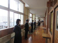 晴天であれば運動場からの計画でしたが、雨天であったため、3年生の教室前廊下で実施しました。
