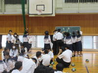 その後、あらかじめ編成されたA団、B団それぞれから代表された3年生による団色決定のバトルです。団色を引く順番を競います。今年度は、時間内のフリースロー対決でした。シュートが決まるたびに、それぞれの団員から大きな歓声が沸き上がっていました。ひさびさに全校生徒が集まり、声を出して盛り上がる雰囲気に、何かジーンとするものがありました