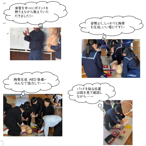 1月16日(金)に、都城警察署の協力をいただき、避難訓練(不審者対応)が実施されました。校内に不審者が侵入したという想定のもと、不審者の対応や避難の仕方を学びました。不審者役は警察の方にお願いし、迫真の演技の中で、職員も生徒も緊張感をもって真剣に取り組むことができました。また、職員向けの講習も実施していただき、短時間ながら質の高い訓練になりました。生徒の避難も危険から遠ざかるという避難の基本を意識して行動できました。先生たちも生徒の皆さんの安全を守るために全力を尽くします。共に安心安全な学校をつくっていきましょう。都城警察署の方々、ご協力ありがとうございました。