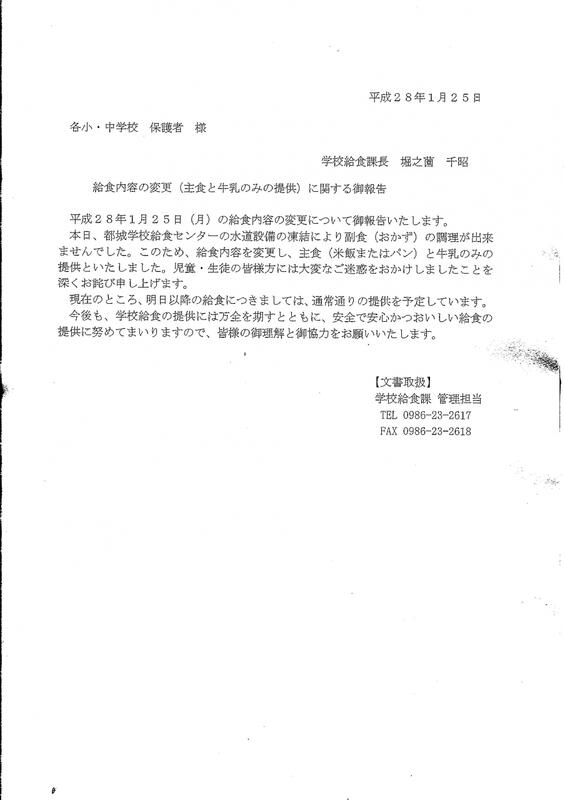 その理由は、給食センターの水道管が凍結し本日のメニューが