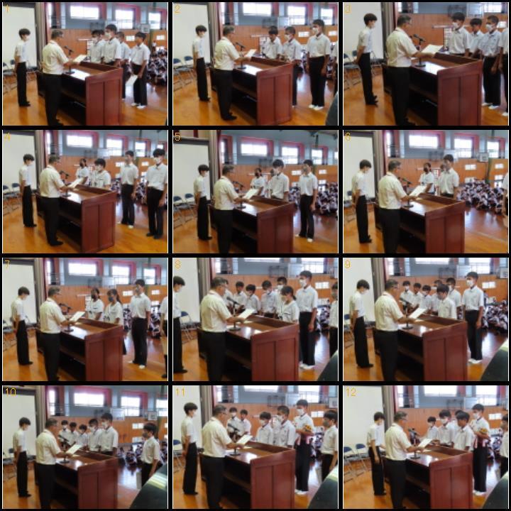 校納式では、大会で入賞した男子ソフトテニス部とサッカー部が後納し、表彰式では、大会やコンクールで入賞した多くの生徒が表彰されました。おめでとうございます。