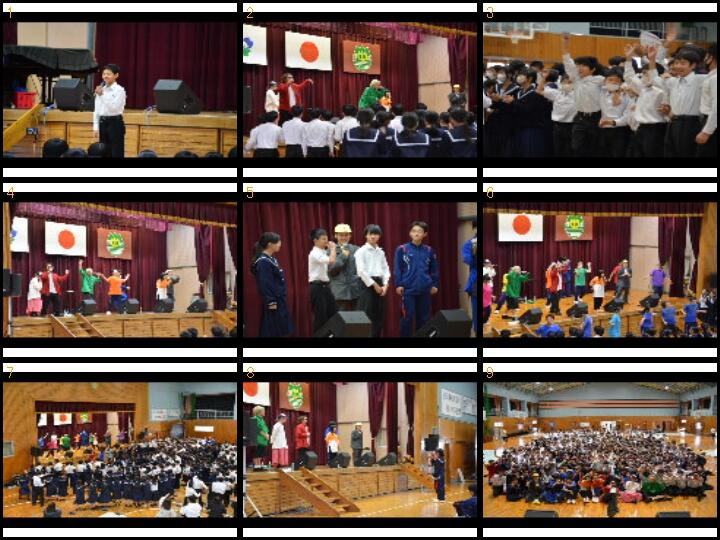 曲の合間には、希望する生徒がステージに上がりボイパコーナーでレッスンを受けたり、代表の生徒が「沖水プリティダンサーズ」として共演したりなど生徒も参加する場面もありました。また、後半は、全校生徒がステージ前に集まり、歌ったり、踊ったりなど大変、盛り上がった鑑賞教室となりました。「じゃーんずΩ」の歌に元気や勇気をもらった生徒も多くいたようでした。素晴らしいステージを披露してくださった「じゃーんずΩ」のメンバーの方々、進行や音響などを務めていただいた都城総合文化ホールの皆様ありがとうございました。