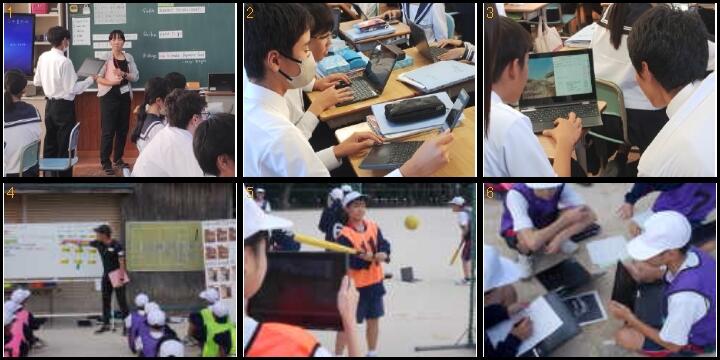 体育の授業では、自分に合ったバッティングフォームを身につけるために、タブレットで撮った自分の姿をもとに、理想の形に近づけるための工夫を個人やグループで吟味しあう授業がなされていました。