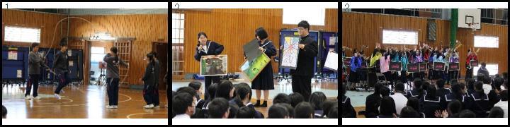 その後、男子バスケ部の元気な掛け声と共に部活動紹介が始まりました。各部、オリジナリティ溢れる紹介で見どころ満点でした。トリを飾る吹奏楽部の演奏ではアンコールの声が上がるなど、大変活気あふれる紹介でした。